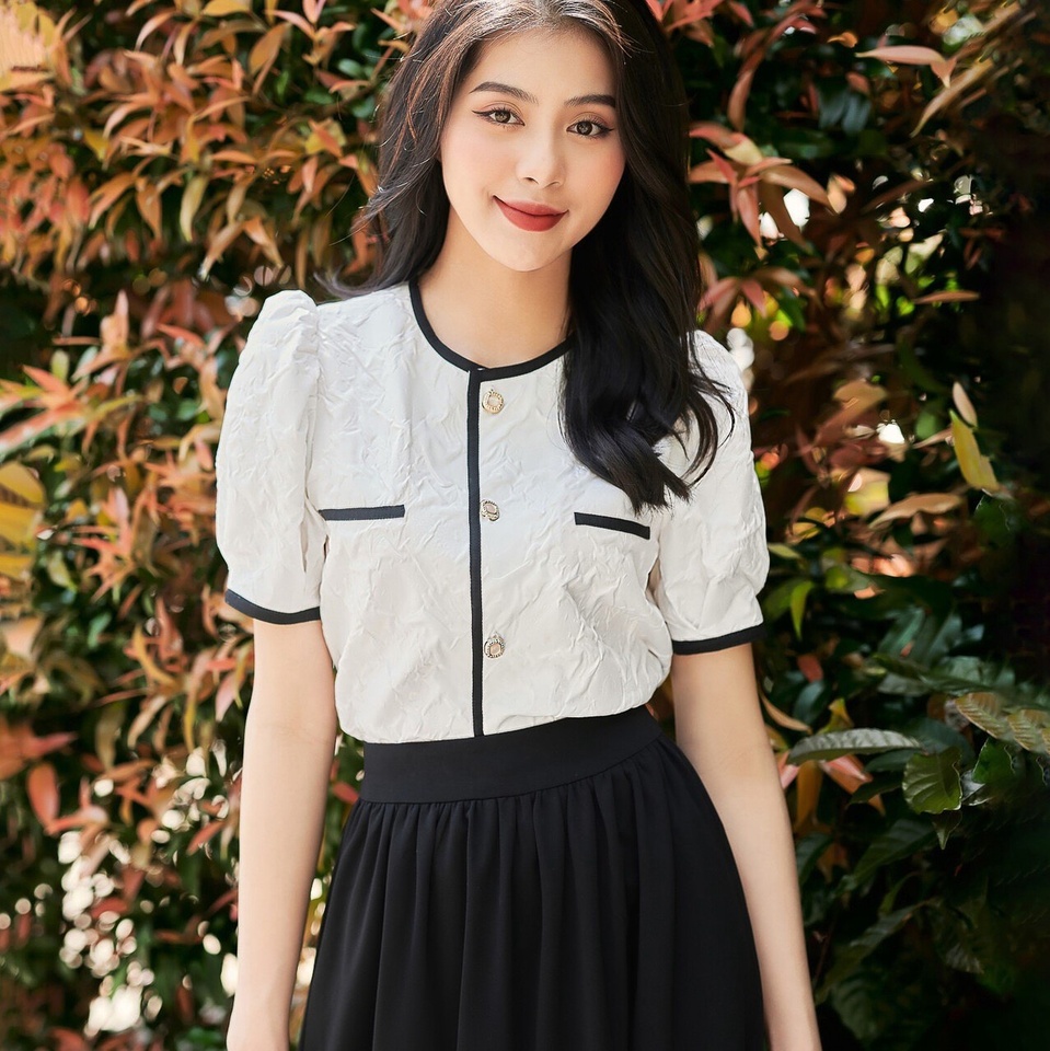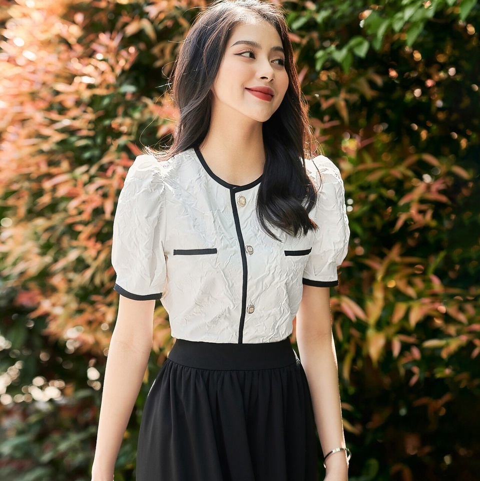 Đơn giản nhưng không đơn điệu, mẫu thiết kế áo sơ mi tay bồng Binky cổ điển với gam màu trắng pha đen được thổi hồn hiện đại với kiểu dáng suông luôn là xu hướng đi đầu.